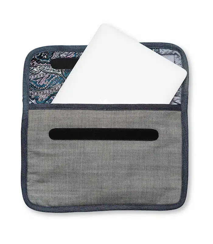 Durable denim and a soft poly scarf lining make this laptop sleeve a stylish, reliable protector for your device, adding a unique touch to your essentials.