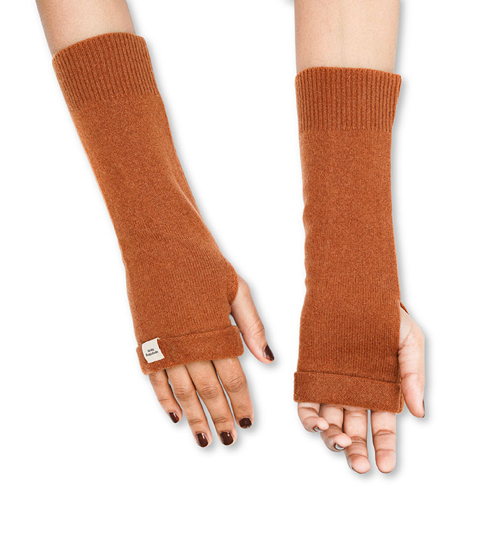 Fingerless cashmere gloves with warm cinnamon and orange, keeping hands cozy while allowing easy movement.
