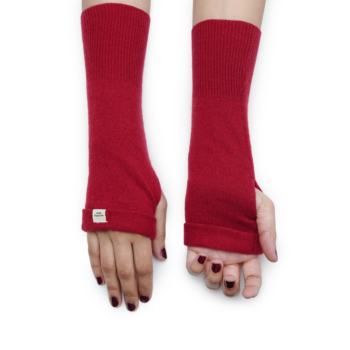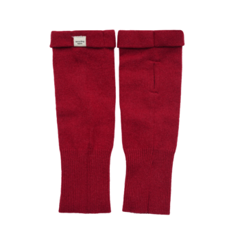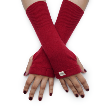 Deep red fingerless knit gloves offering warmth, comfort, and a versatile fold-over design for everyday use.