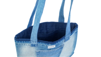The Denim Lattice Reversible Tote Bag is made from reclaimed denim seams, transformed into a sturdy reversible bag. Designed for everyday use, it includes an interior pocket to keep essentials organized and easy to reach.