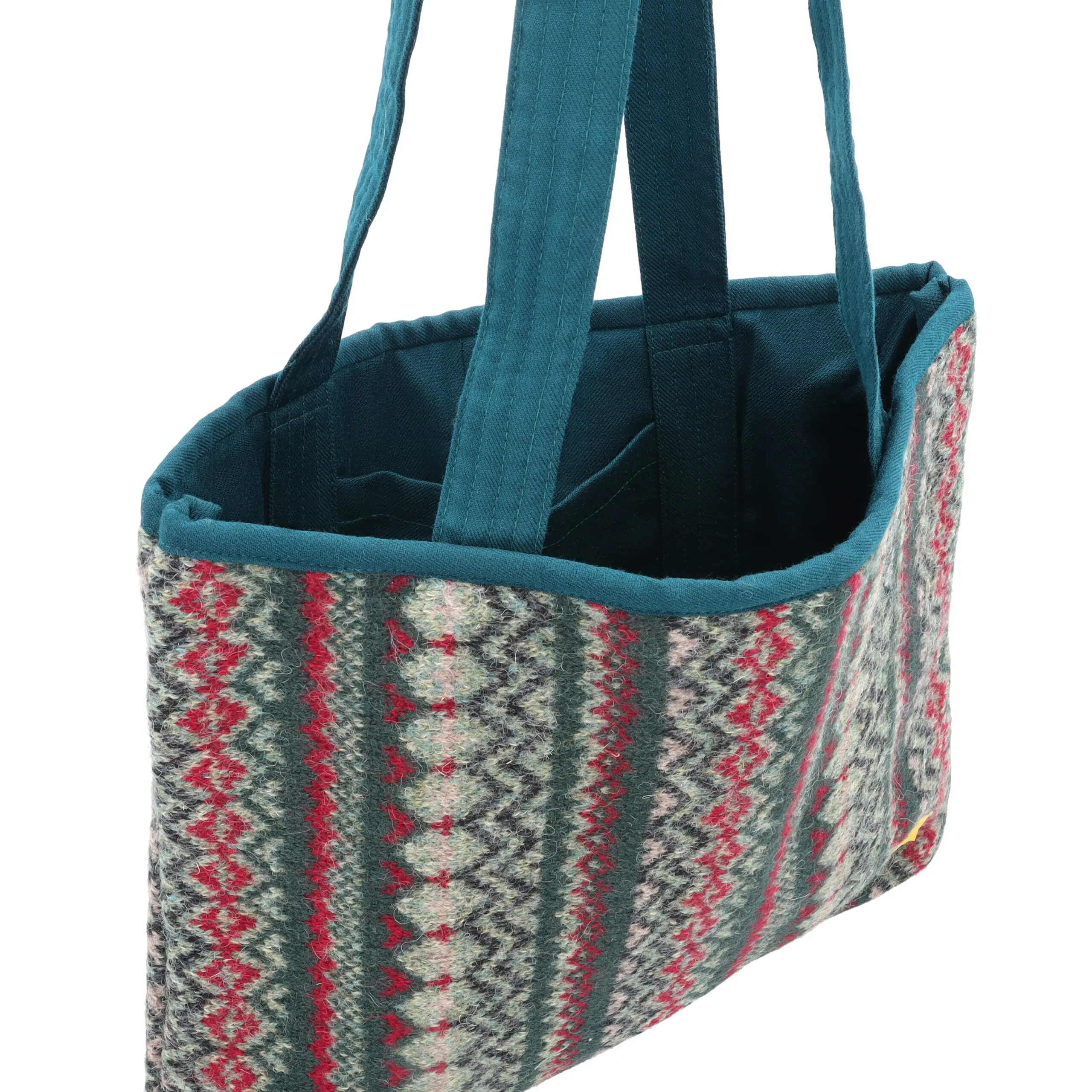 Designed with a fully reversible structure, this tote gives you two unique patterns in a single bag—allowing you to switch looks without adding to waste. The structured wool fabric provides strength without compromising comfort, while the interior pocket keeps essentials like your cellphone and cards within easy reach.