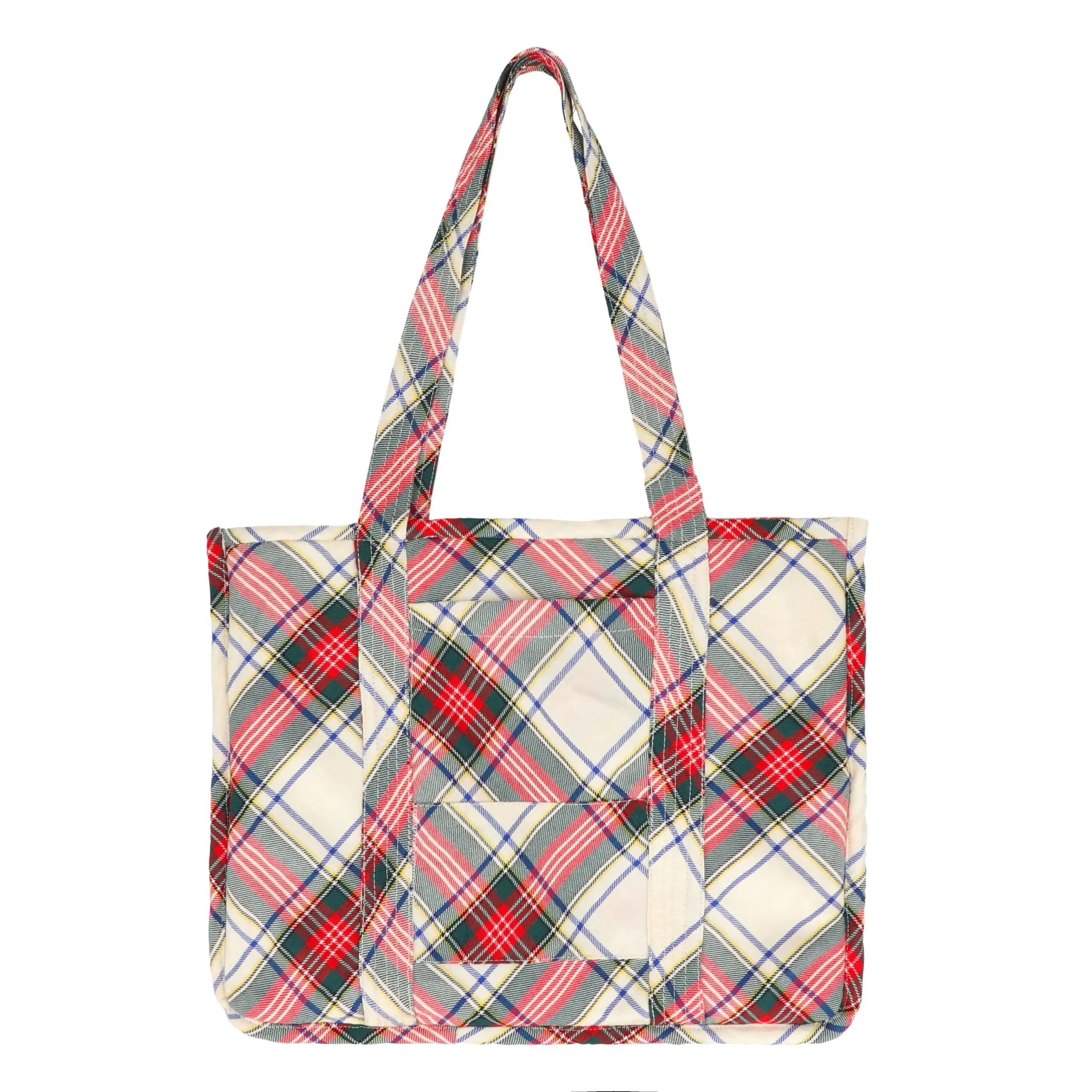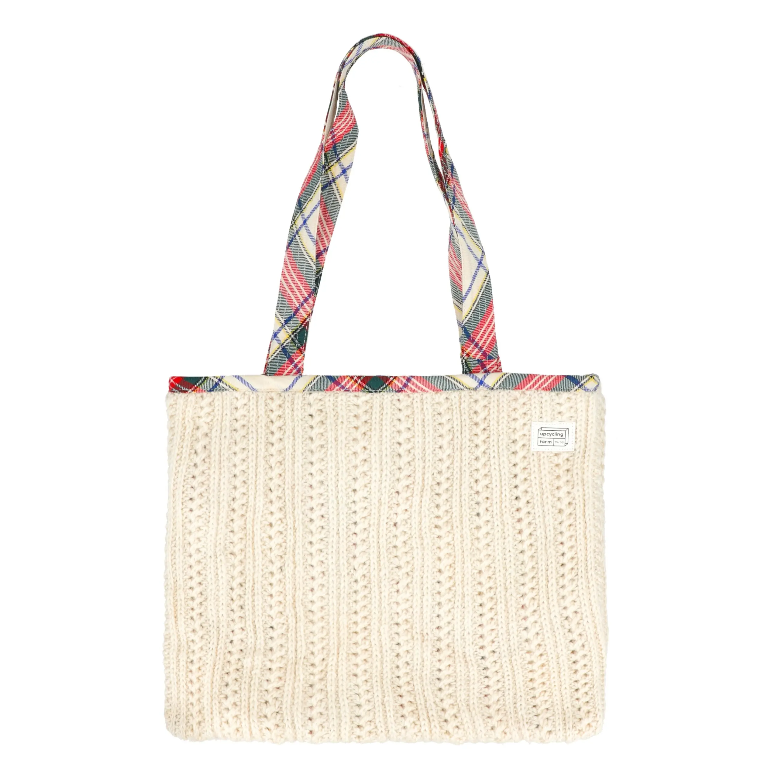 Timeless on the outside, expressive on the inside—meet our Ivory–Crosscheck Reversible Tote Bag, made from 100% upcycled wool sweaters. One side features a soft ivory cable-knit texture that feels warm and classic, while the reverse reveals a bold crosscheck pattern woven with multicolor threads, adding depth and personality.
