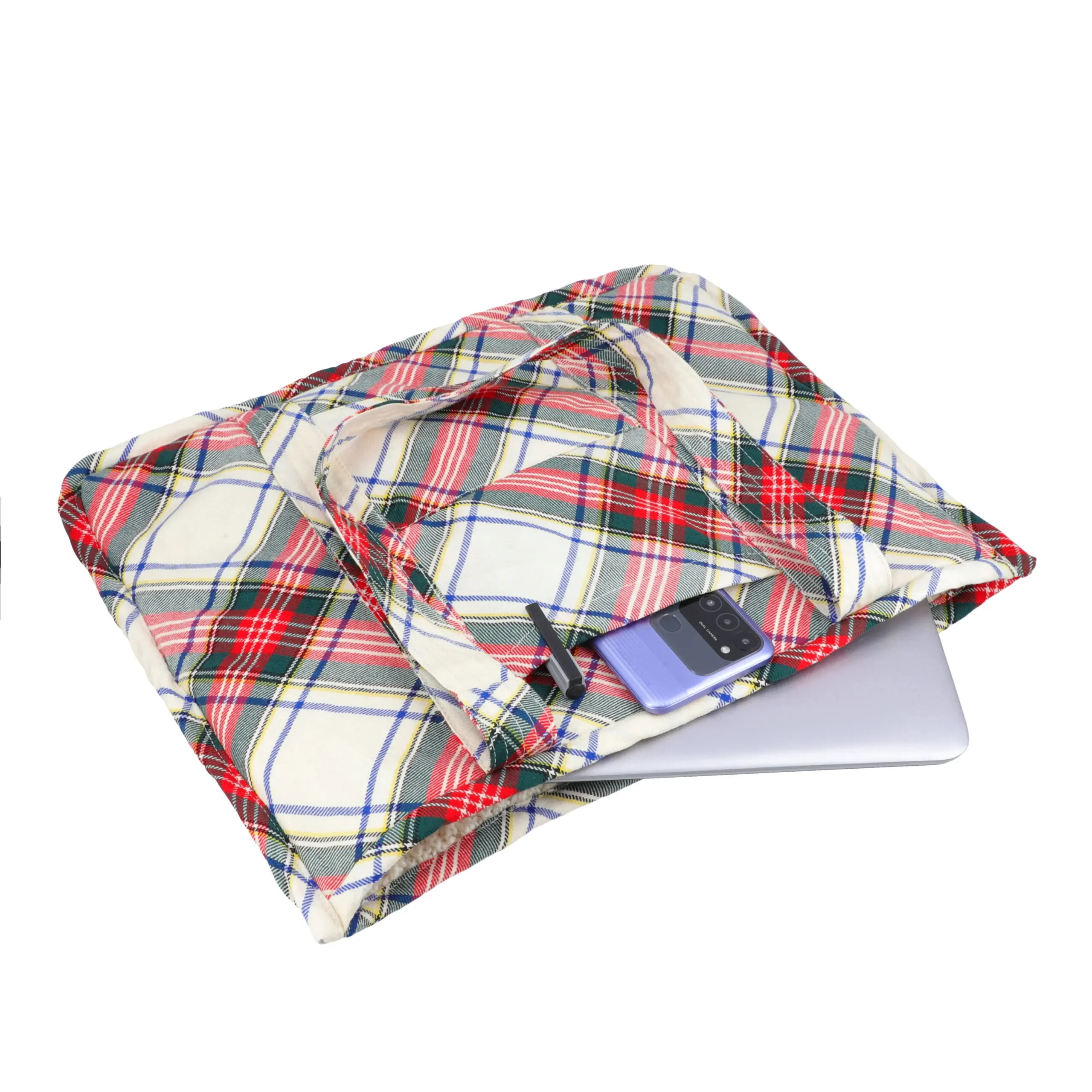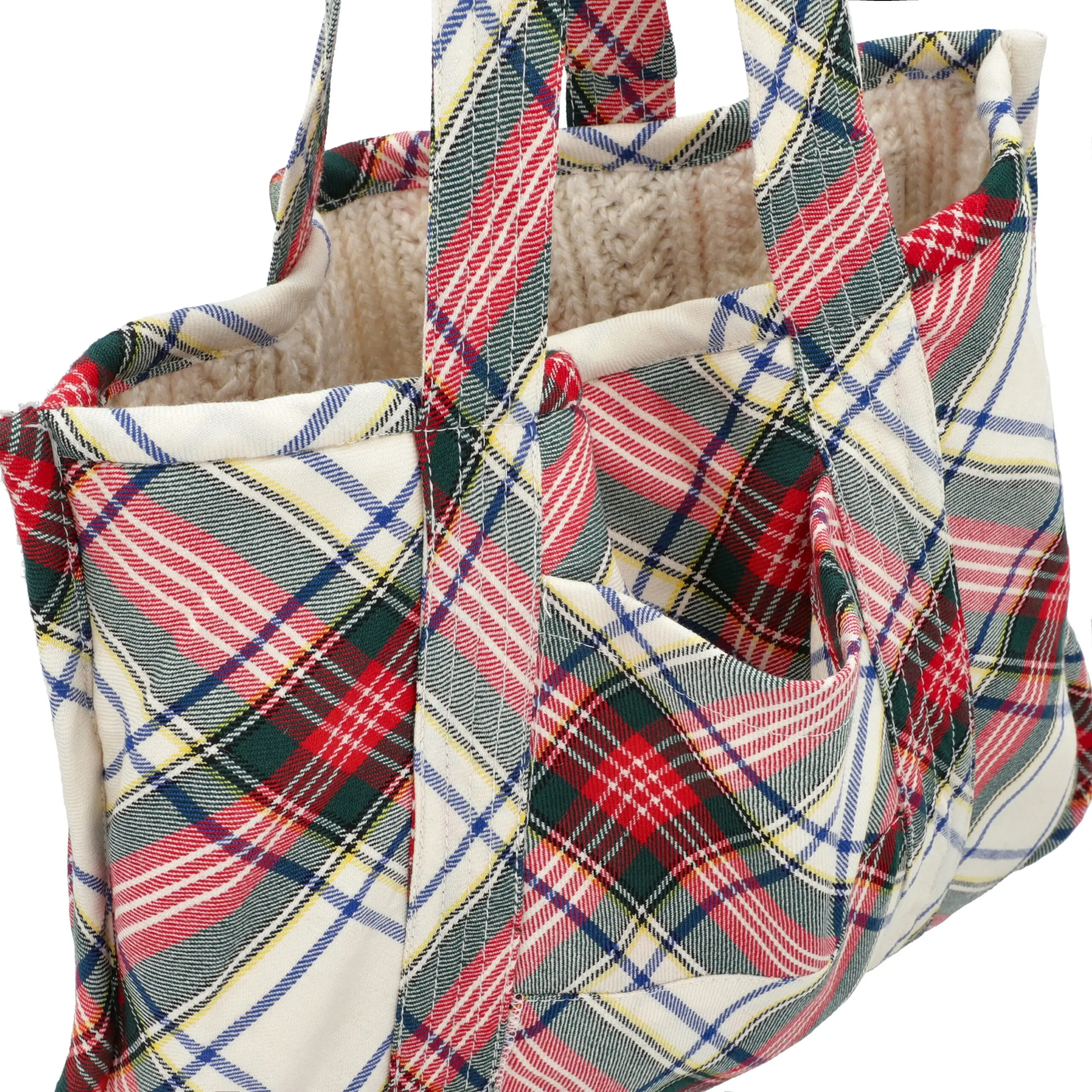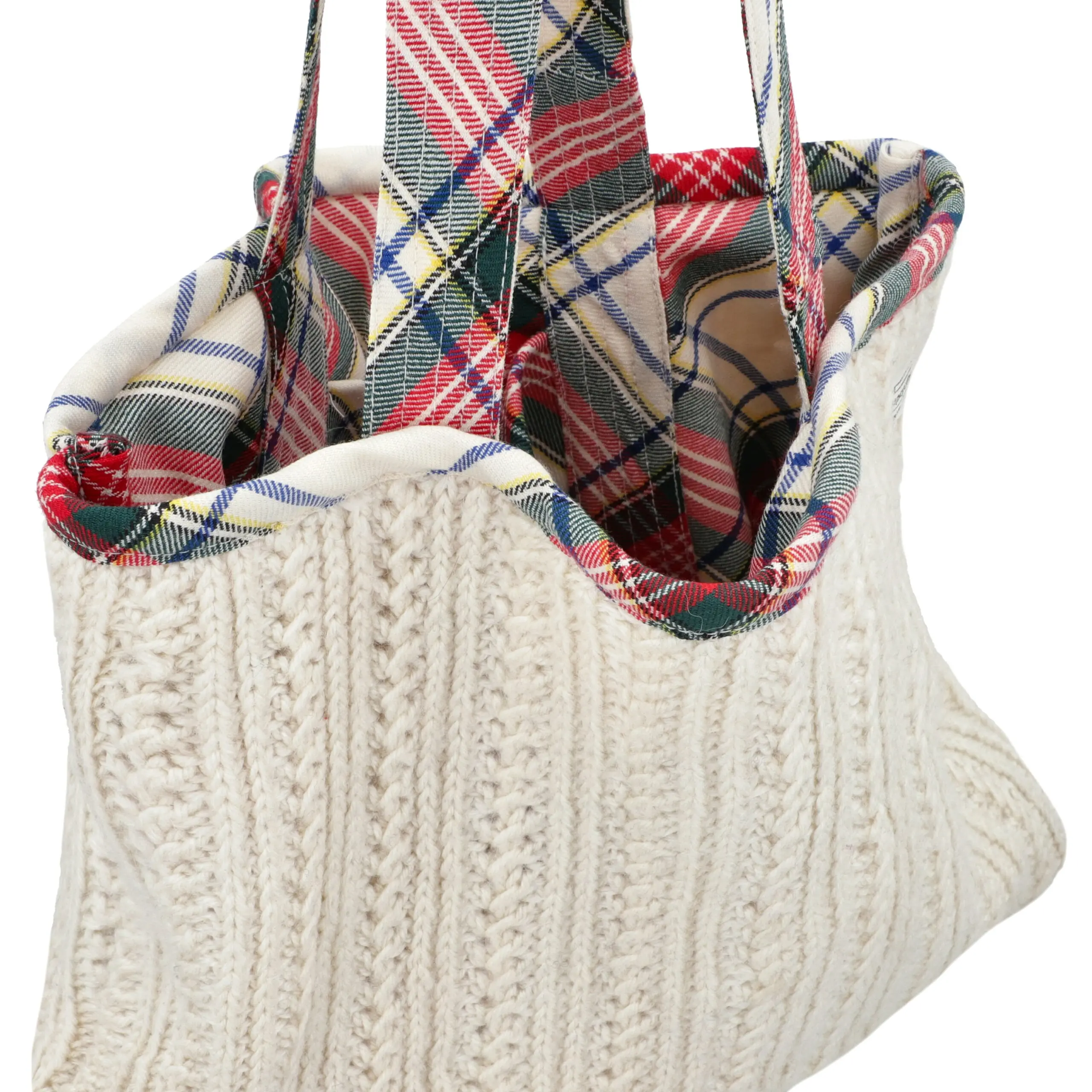 Introducing our reversible tote bag in Ivory–Crosscheck, crafted from 100% upcycled sweaters. Featuring a cozy ivory cable-knit exterior and a distinctive crosscheck patterned wool reverse, this bag blends texture, character, and sustainability—finished with a practical inner pocket for everyday use.