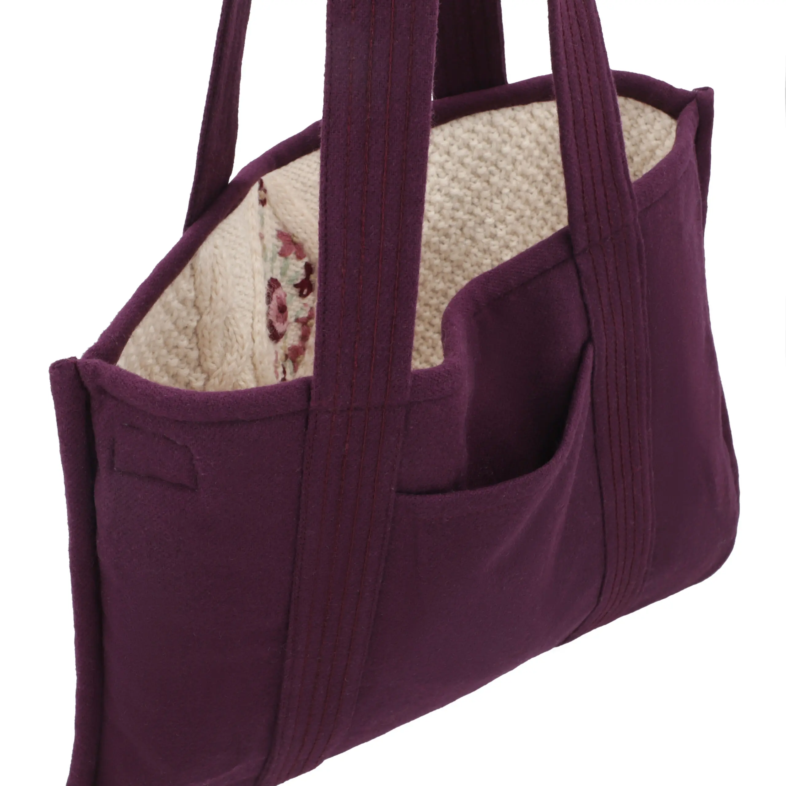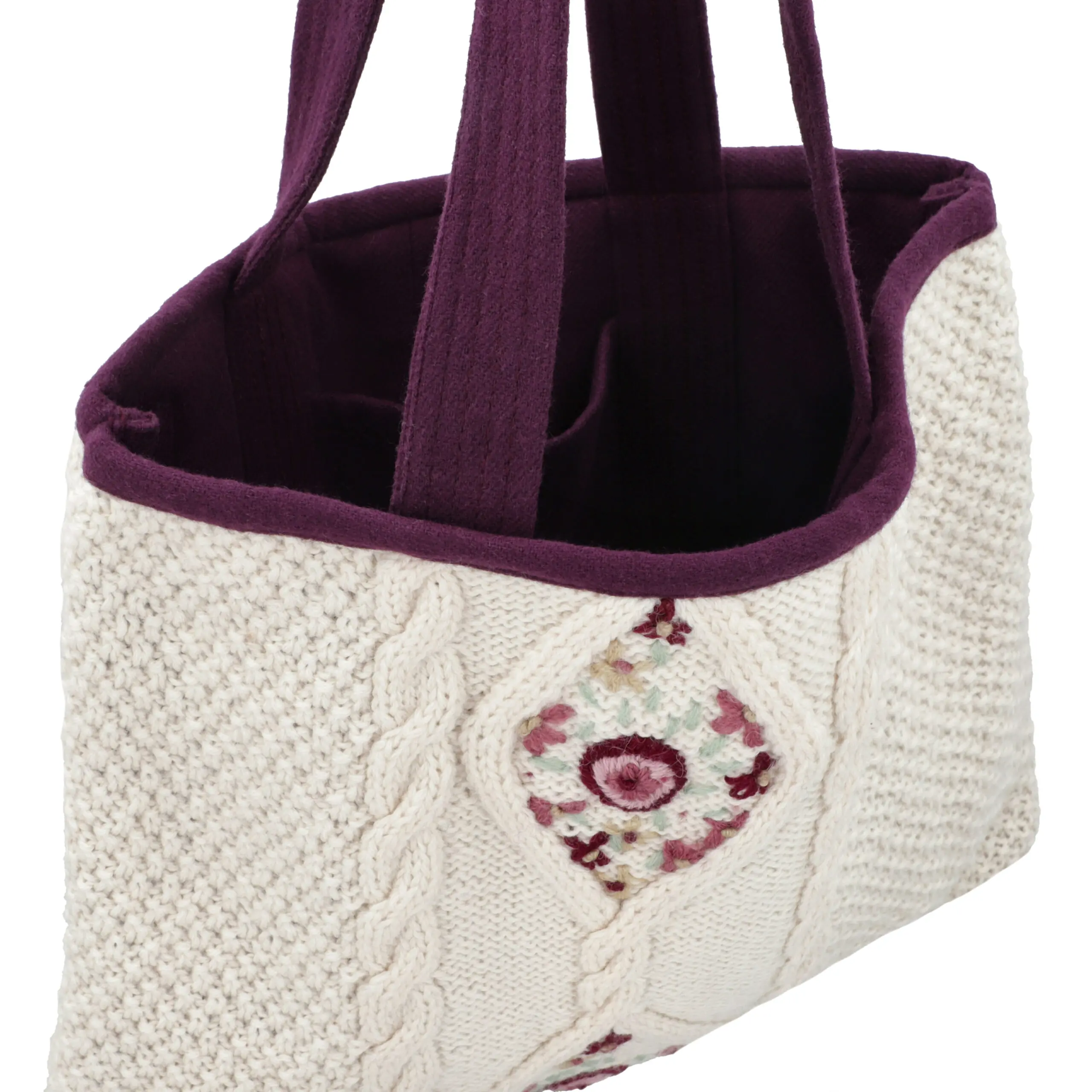 Refined, cozy, and consciously made—meet our Ivory–Purple Reversible Tote Bag, created from 100% upcycled wool sweaters. One side showcases a beautifully textured ivory knit with subtle embroidery that adds a handcrafted charm, while the reverse reveals a rich purple wool interior for a bold yet sophisticated contrast.