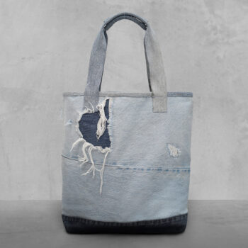Inspired by the beauty of twilight, the Midnight Horizon Tote features repurposed deep indigo denim on the outside and a soft wool lining inside, creating a striking contrast of textures. Spacious (16.5” x 16” x 4”) and designed for everyday versatility, this tote easily accommodates books, tech, and essentials.