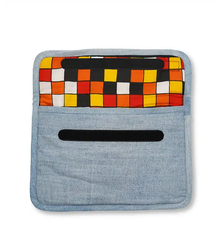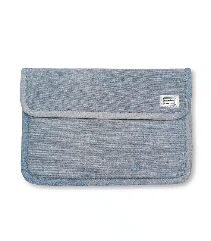 This denim-repurposed laptop sleeve offers rugged durability with a soft poly scarf interior for added protection, keeping your device safe in style.