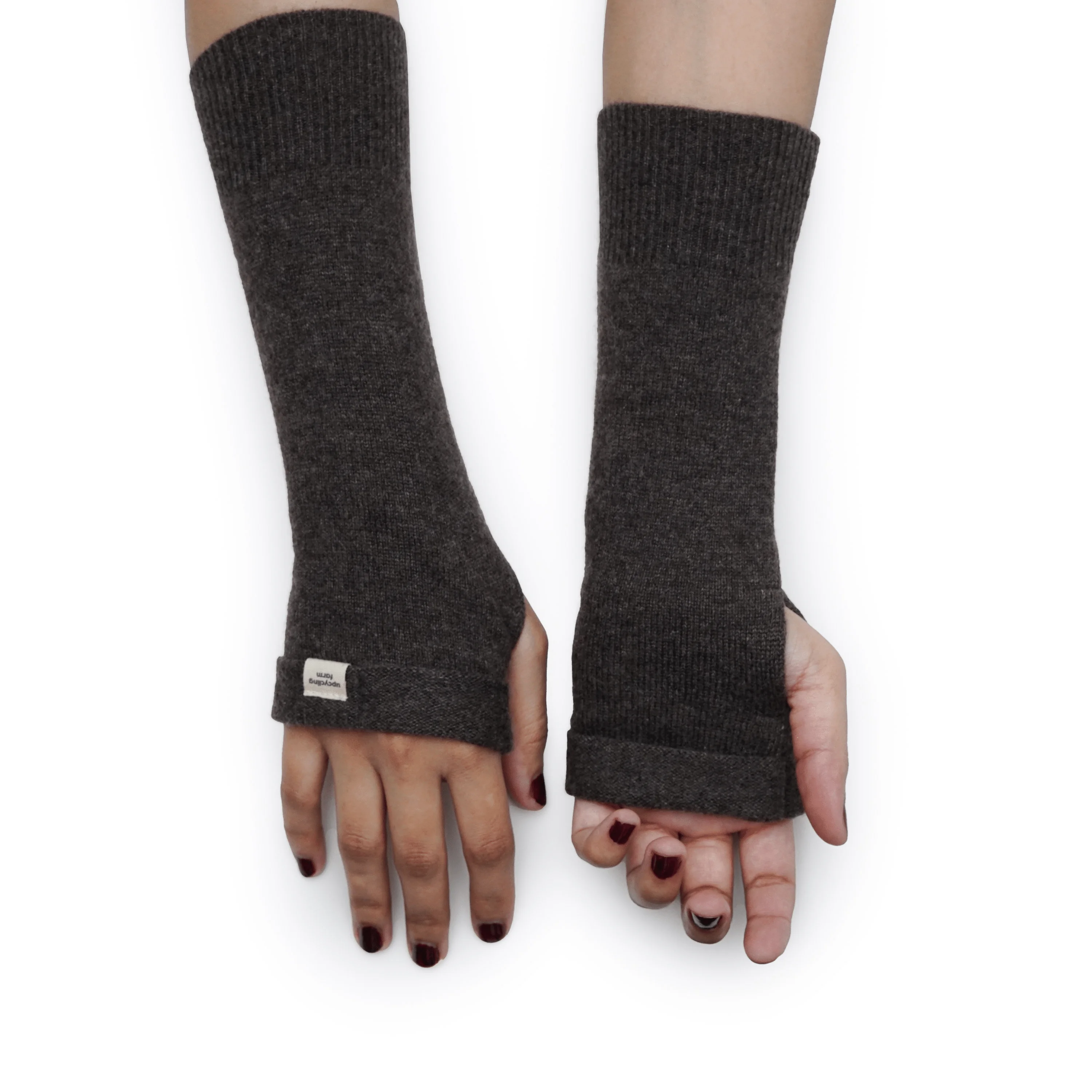 Smoke Grey fingerless cashmere gloves in a deep, earthy tone, offering soft warmth, everyday comfort, and timeless understated elegance.