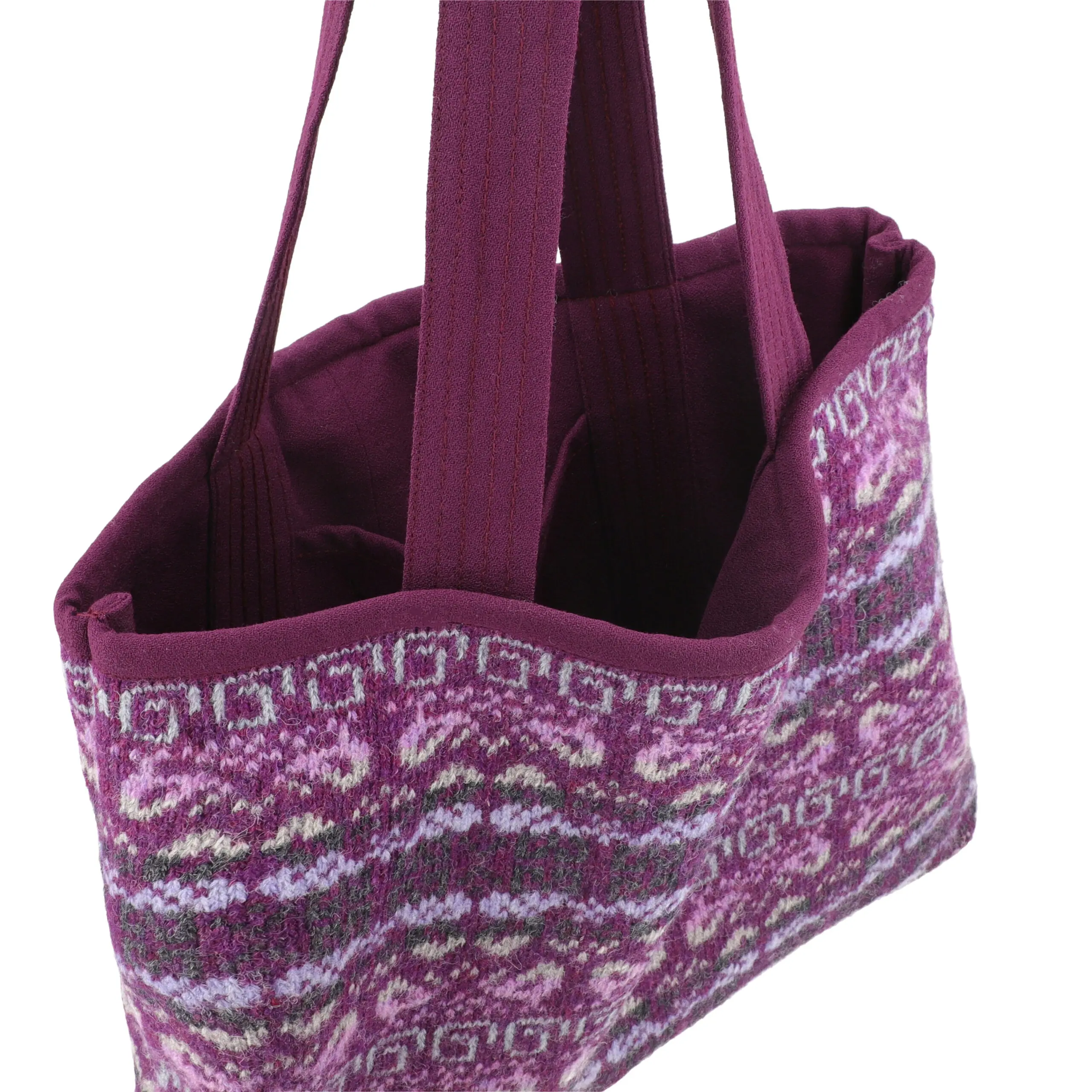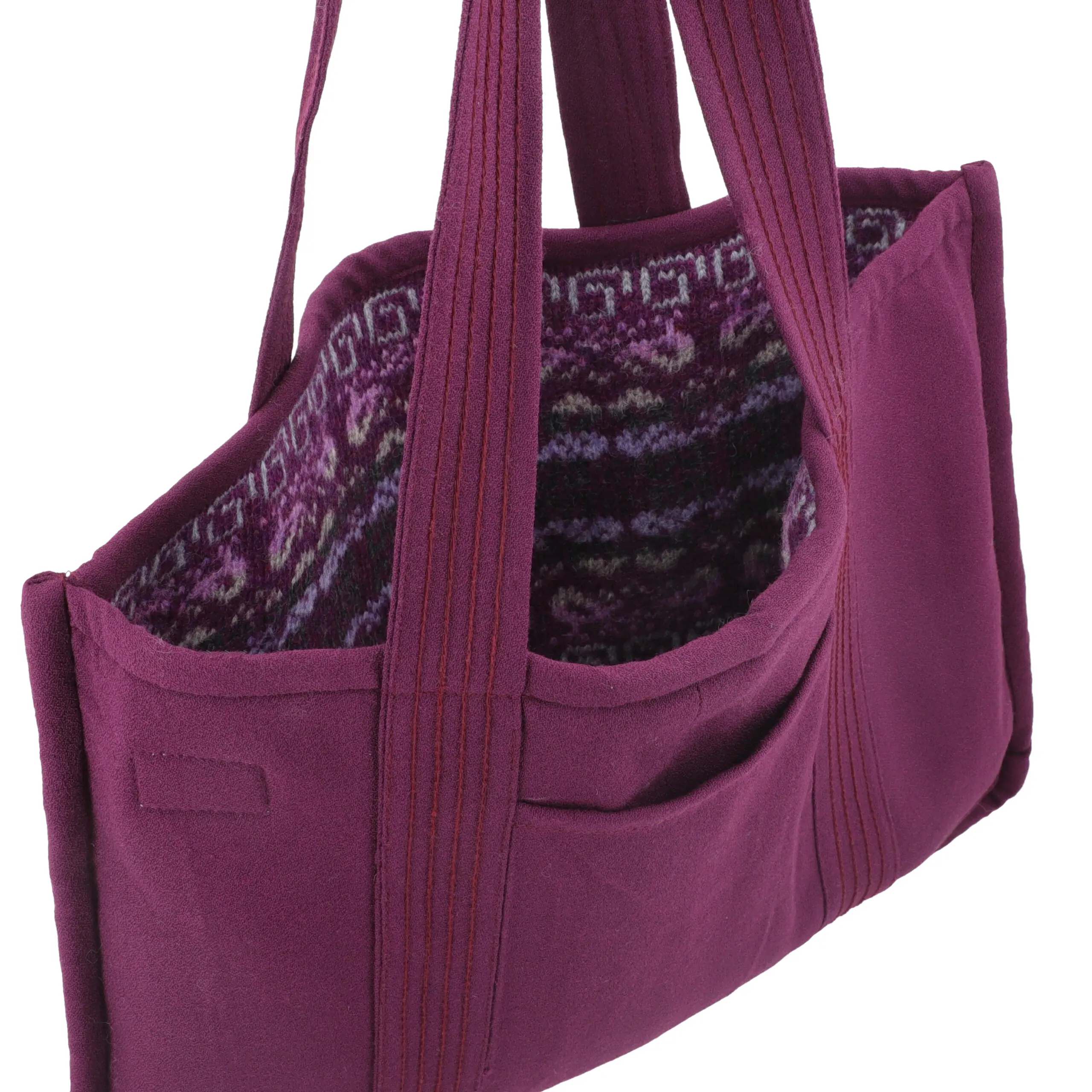 The Violet Hearth Tote is crafted from 100% upcycled wool, offering a durable and reversible design suited for everyday use. With two distinct patterns in one bag and a convenient interior pocket for your phone and cards, it combines thoughtful function with conscious craftsmanship.