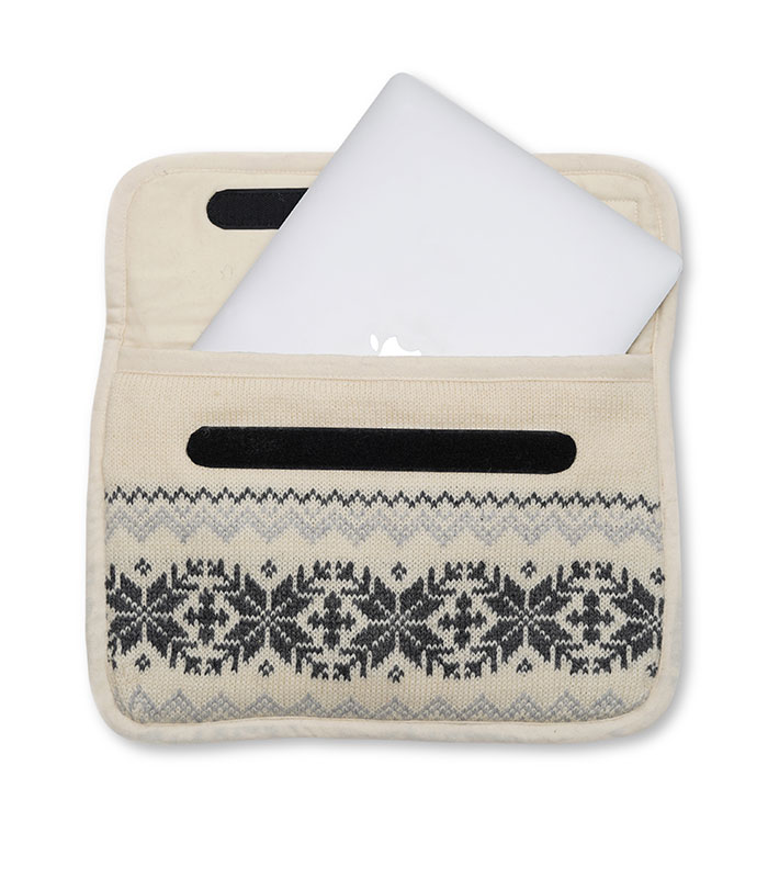 The Winter Frost Laptop Sleeve features a peaceful winter-inspired design with repurposed wool, offering snug, eco-friendly protection for your slim laptop.